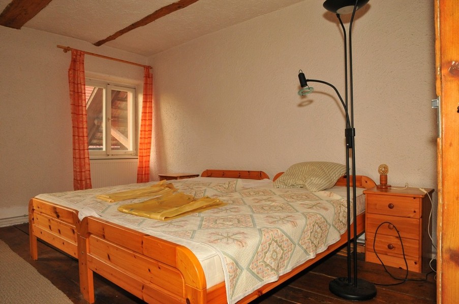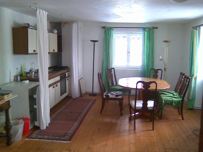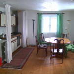 Das im Landhausstil eingerichtete Appartement mit Holzboden besteht aus einem Wohn-/Ess- und Schlafzimmer und einer grossen Einbauküche.